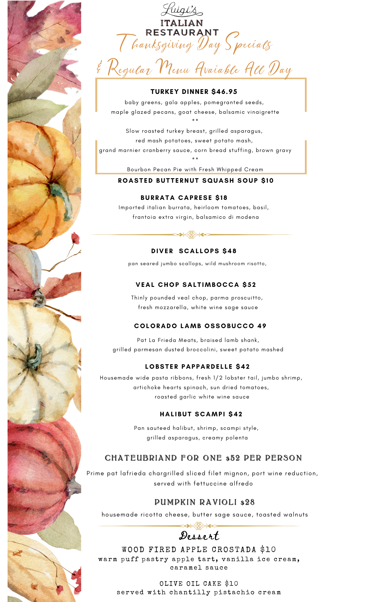 Enjoy our Thanksgiving Special Menu or Choose from Our Regular Menu.